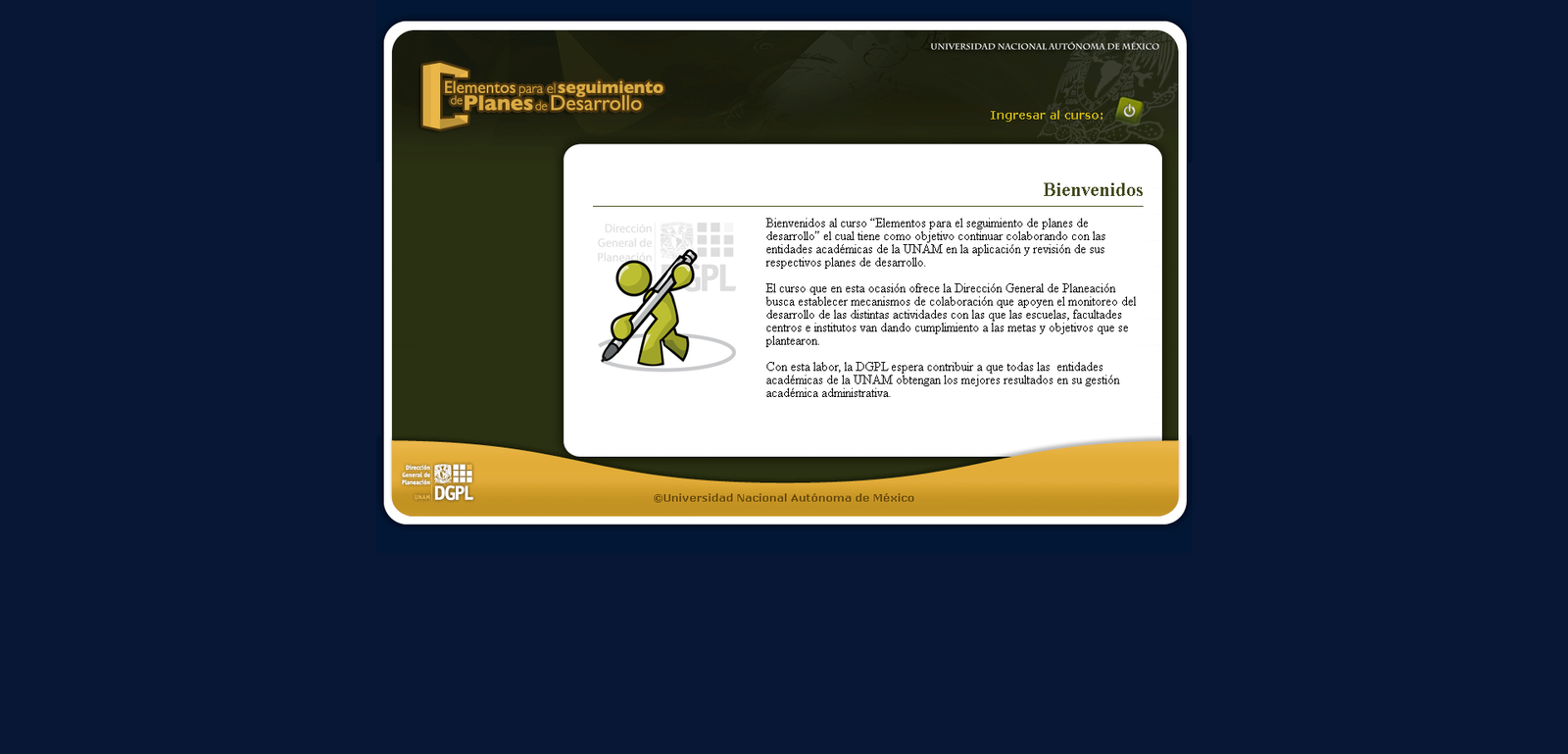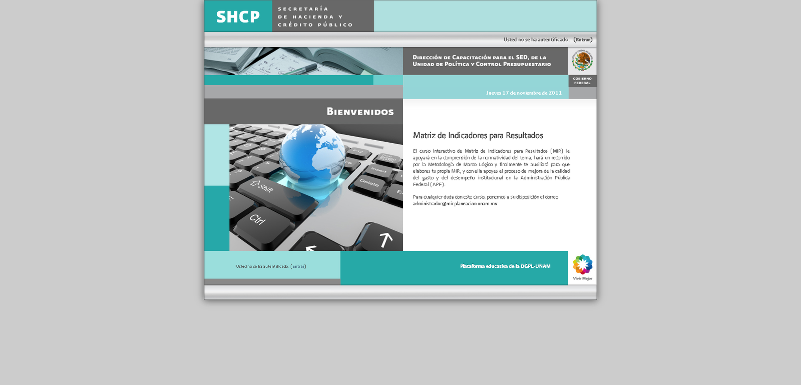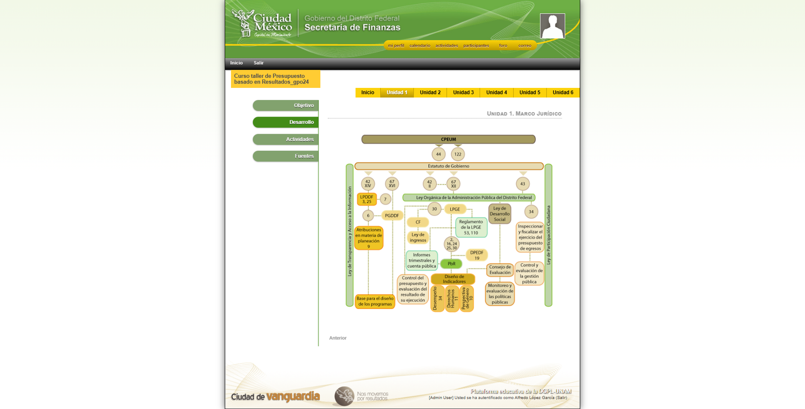 [+] 35.1.- Plataforma Educativa Mixta (b-learning: modalidad virtual y presencial) sobre Planeación y Presupuesto Basado en Resultados (PBR-DF), desarrollada por la Dirección General de Planeación (DGPL) de la Universidad Nacional Autónoma de México (UNAM) para la Secretaría de Finanzas del Gobierno del Distrito Federal (DF).