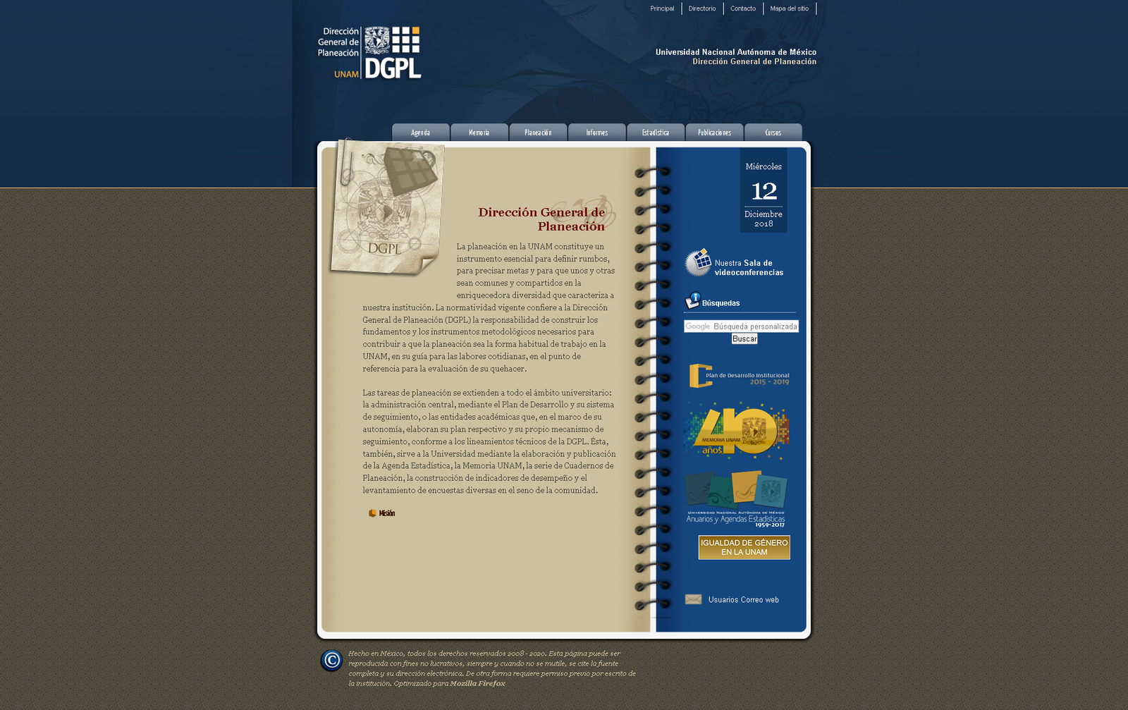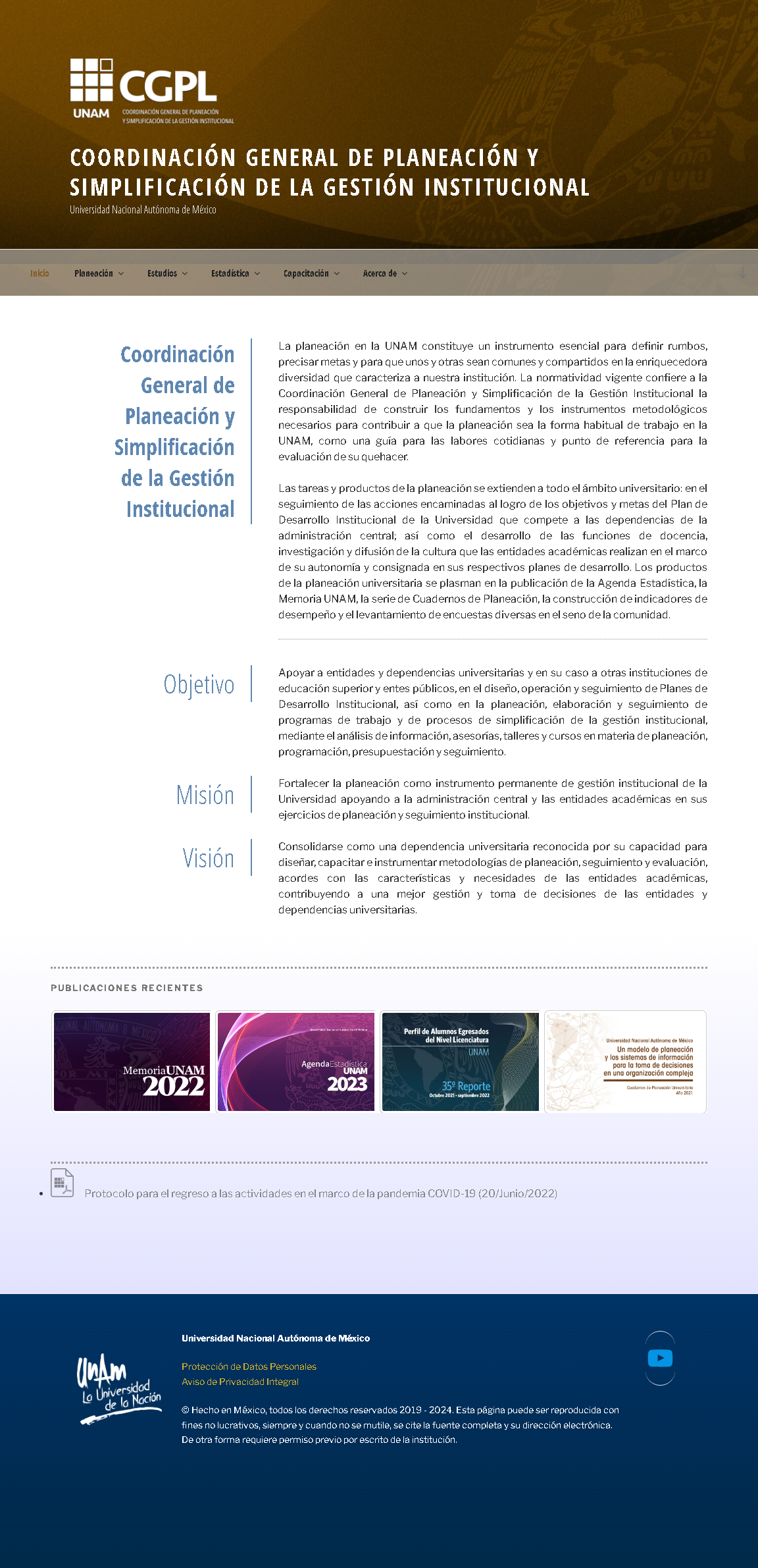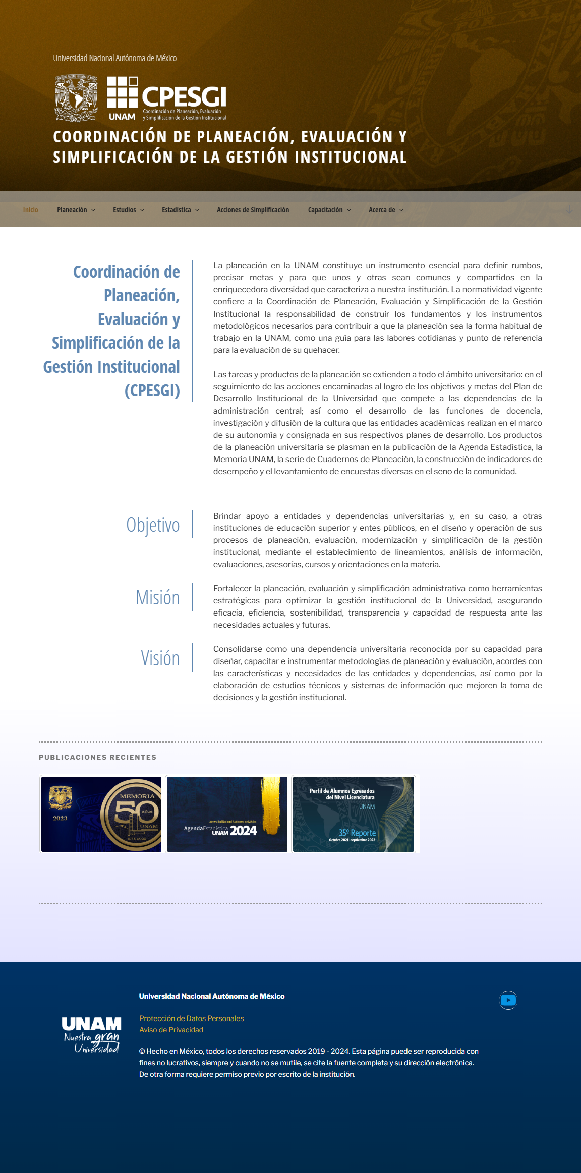 El sitio planeacion.unam.mx corresponde al portal de la Coordinación de Planeación, Evaluación y Simplificación de la Gestión Institucional (CPESGI) de la Universidad Nacional Autónoma de México (UNAM). En él se presentan las estrategias, lineamientos e información relevante para el desarrollo y evaluación de la planeación institucional, sirviendo como un enlace entre la comunidad universitaria y los procesos de organización y mejora continua en la UNAM. Su objetivo principal es asegurar la coherencia entre los planes de trabajo de las diversas entidades universitarias y la misión general de la Universidad, promoviendo una gestión eficiente y transparente.