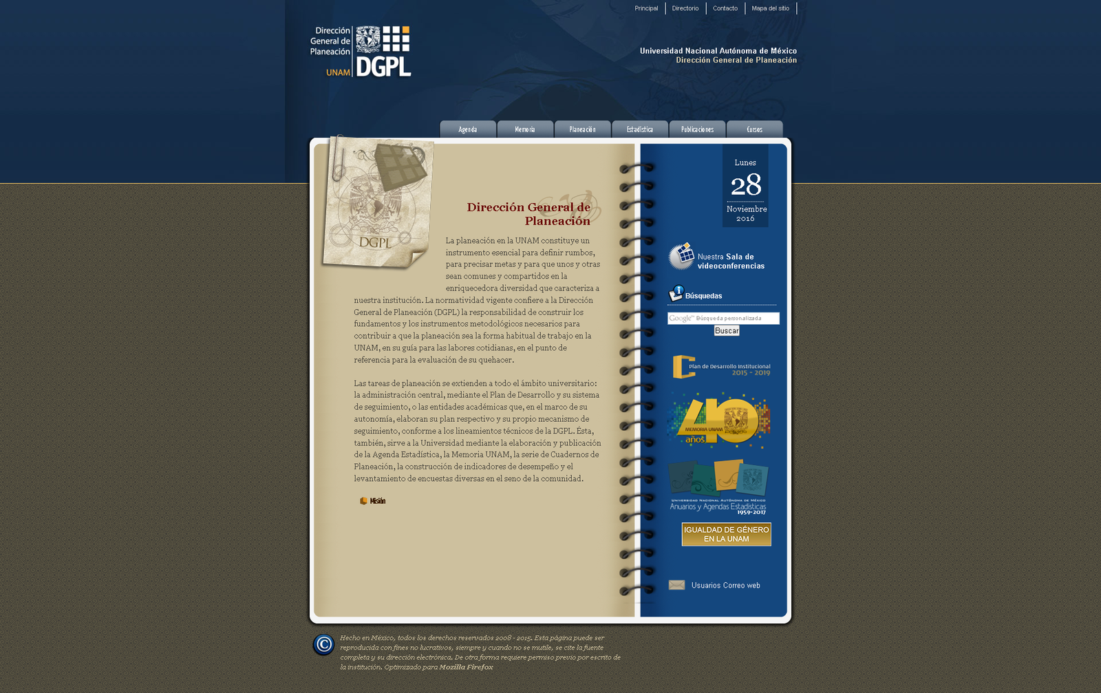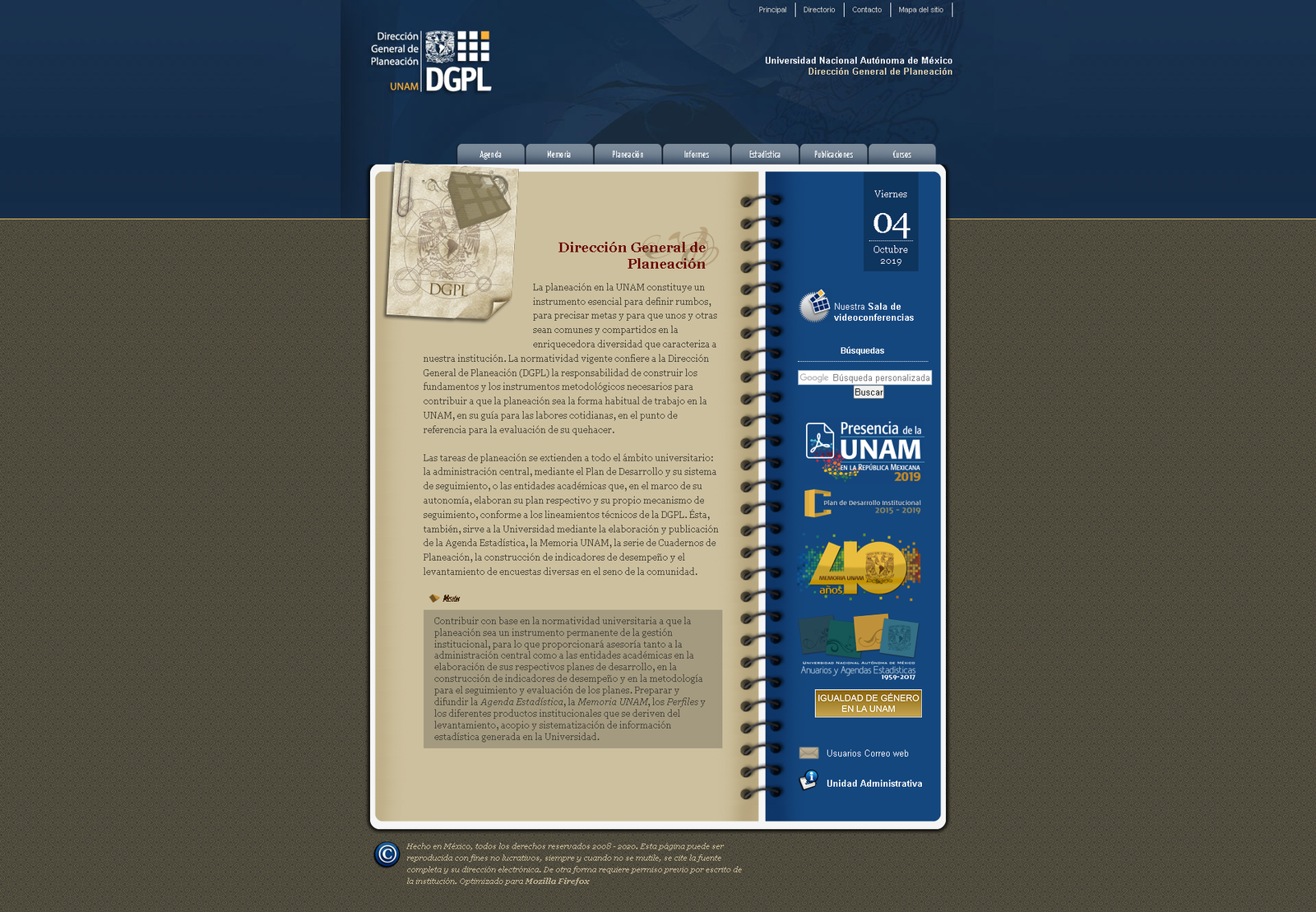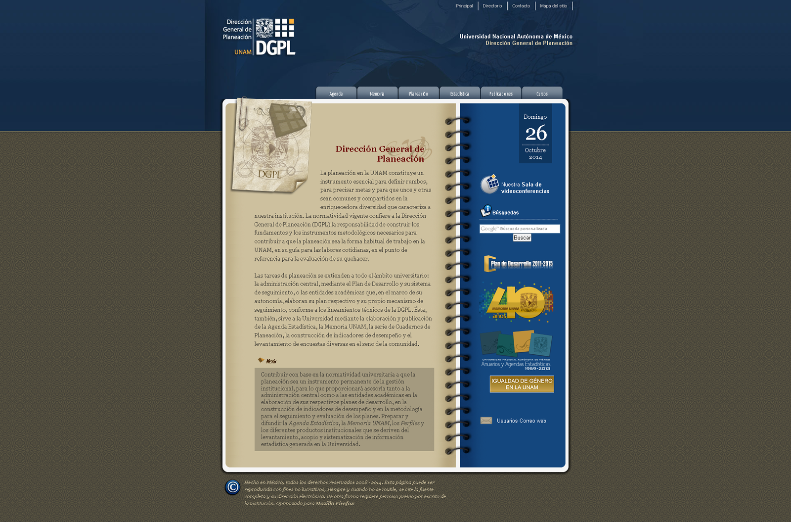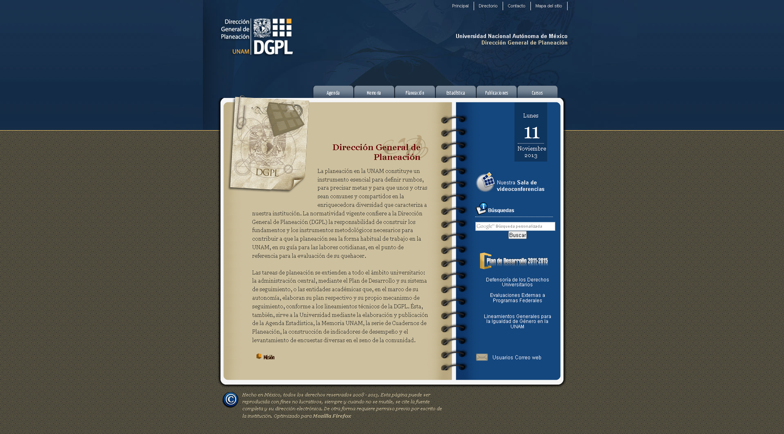 El sitio planeacion.unam.mx corresponde al portal de la Coordinación de Planeación, Evaluación y Simplificación de la Gestión Institucional (CPESGI) de la Universidad Nacional Autónoma de México (UNAM). En él se presentan las estrategias, lineamientos e información relevante para el desarrollo y evaluación de la planeación institucional, sirviendo como un enlace entre la comunidad universitaria y los procesos de organización y mejora continua en la UNAM. Su objetivo principal es asegurar la coherencia entre los planes de trabajo de las diversas entidades universitarias y la misión general de la Universidad, promoviendo una gestión eficiente y transparente.