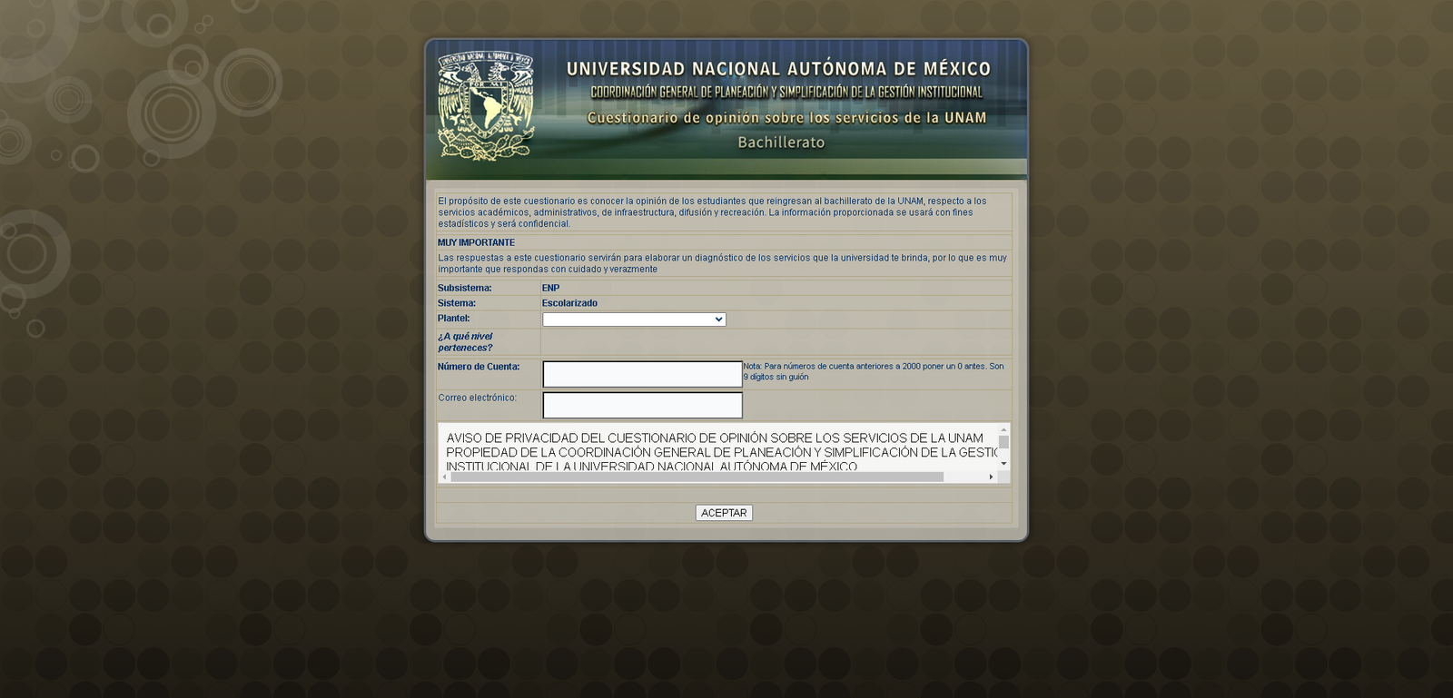 [+] 1.12.15.- Cuestionario de Opinión (Licenciatura) sobre los Servicios de la UNAM